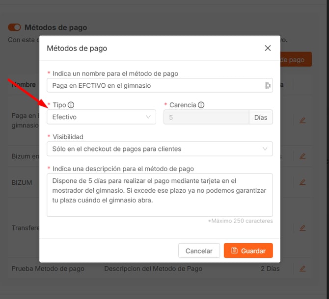 Si una vez relacionados los métodos de pago con Alegra necesitas crear un nuevo método de pago, sólo tendrás que crearlo en Trainingym Manager y, según el tipo indicado, Alegra lo tomará como referencia.
