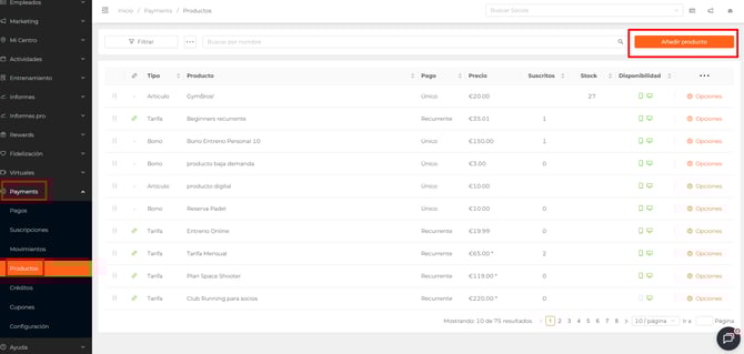 Dirígete a la sección de Productos y selecciona añadir o editar un producto (tarifa o bono).