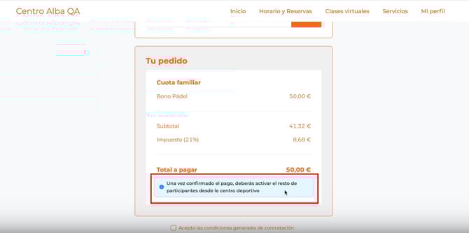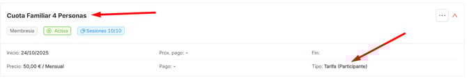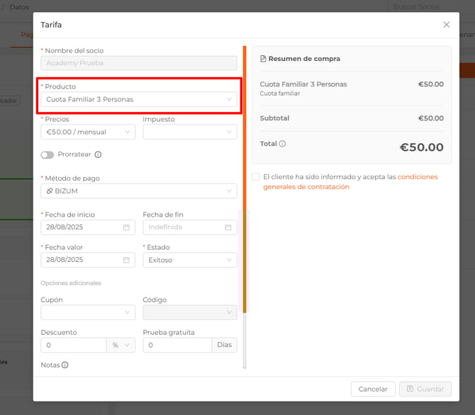 - Selecciona la tarifa o bono previamente configurado como familiar.