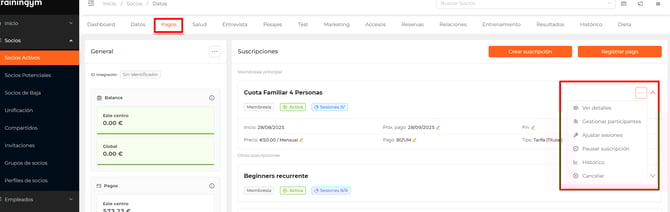 Es importante tener en cuenta que la suscripción SIEMPRE se va a gestionar desde la ficha del socio titular. Por ello, si accedes a la ficha del socio o desde payments-suscripciones, podrás: