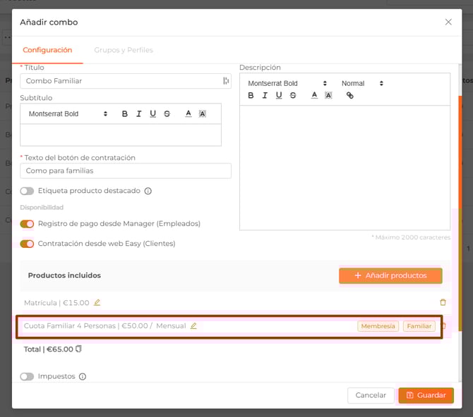 Al crear un combo, podrás identificar las tarifas y bonos familiares con la etiqueta Familiar.