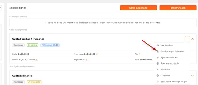Puedes añadir o eliminar participantes tanto desde Payments-Suscripciones como desde la ficha del socio titular.