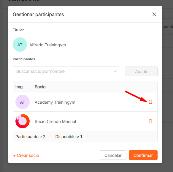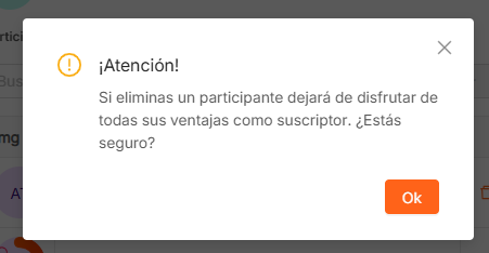 - Eliminar Participantes: solo tienes que clicar en la papelera en el socio que desees eliminar. Te aparecerá un modal para confirmar que quieres eliminar al socio de la suscripción y que deje de disfrutar de las ventajas. Una vez aceptes, ya no aparecerá el socio y solo tendrás que confirmar.