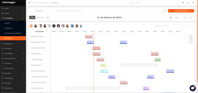 Una vez dentro del calendario verás todos los eventos agendados a los diferentes empleados, diferenciando por el color asignado a cada actividad, tarea o servicio. Además, verás sombreado en gris el horario configurado para cada empleado, de cara a programar eventos desde Trainingym Manager.