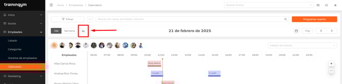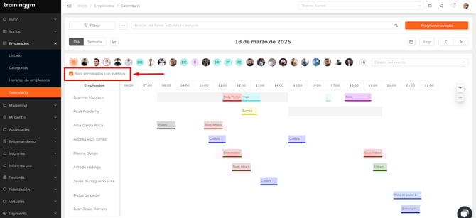 ℹ️ El calendario cuenta con un filtro realizado en el que sólo muestra los empleados que tienen tareas asignadas. En caso de que desees ver todos los empleados de tu centro, sólo tienes que desactivar la opción de "Solo empleados con eventos" y aparecerán todos.