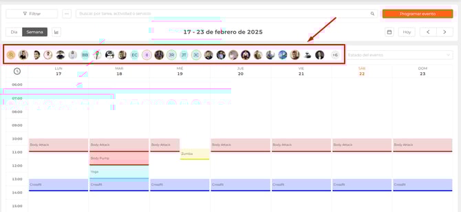 Te aparecerán todos los empleados de tu centro y sus eventos asociados, podrás mostrar los eventos de los empleados que desees, clicando sobre las fotos de los que necesites.