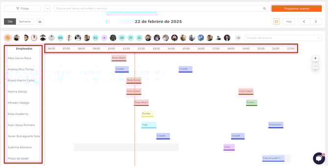 ℹ️ En la vista diaria, aparecerán los empleados en la columna lateral y las horas en la fila superior.
