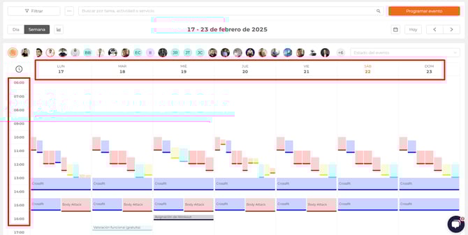 En la vista semana, aparecerán las horas en la columna lateral y los diás de la semana en la fila superior.