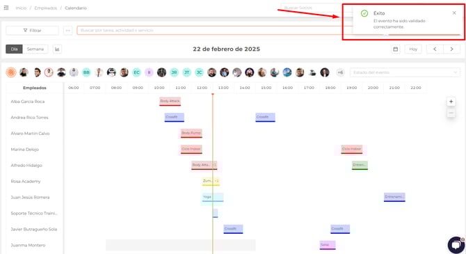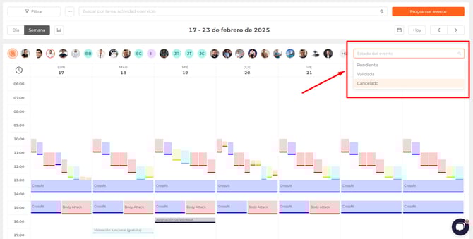 Podrás filtrar por eventos pendientes, validados o cancelados.