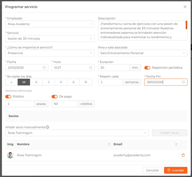 - Repetición periódica: si se trata de un servicio que se repetirá con asiduidad, activa esta opción y selecciona los días que se repetirá, cada cuantas semanas se repite y la fecha de fin.