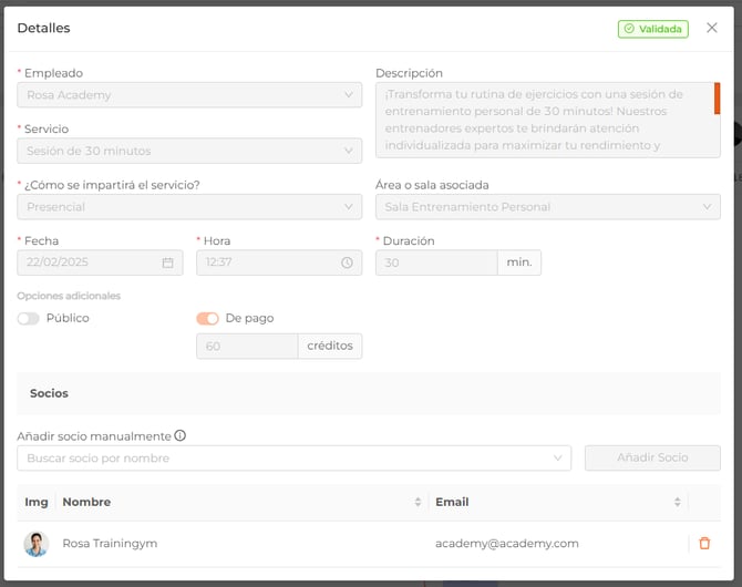 - De pago: indicando los créditos a consumir si tu negocio trabaja con el módulo de créditos. En caso de no trabajar con el módulo de créditos, simplemente descontará una sesión de la suscripción del socio.