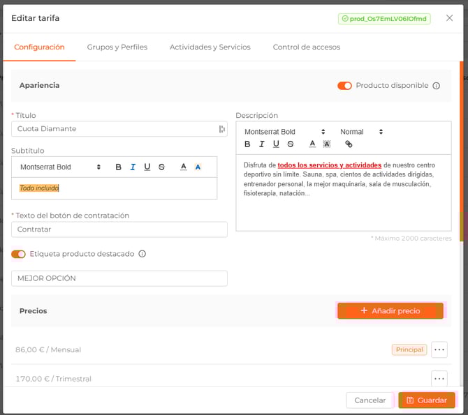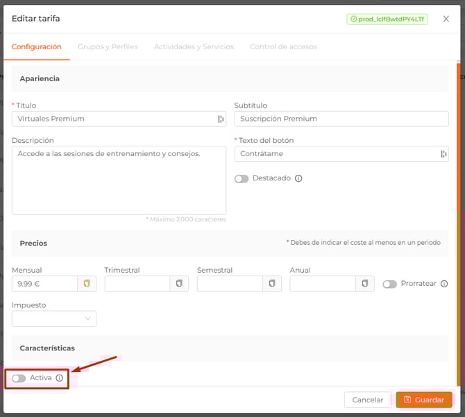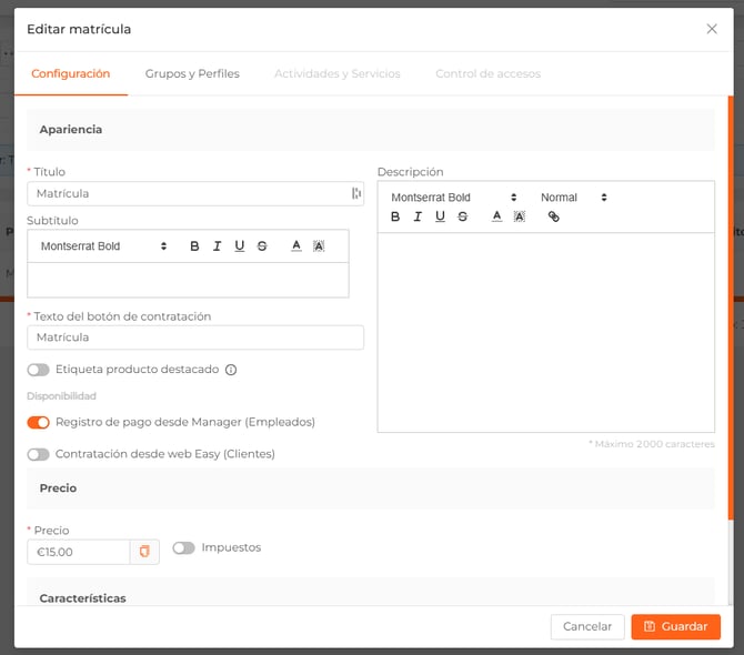 - Precio. Consiste en un único pago y puede contener una fecha de caducidad y/o un límite de sesión. Precio obligatorio.