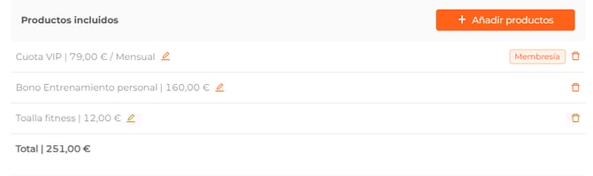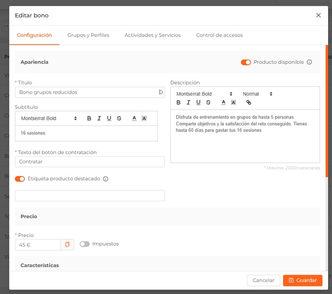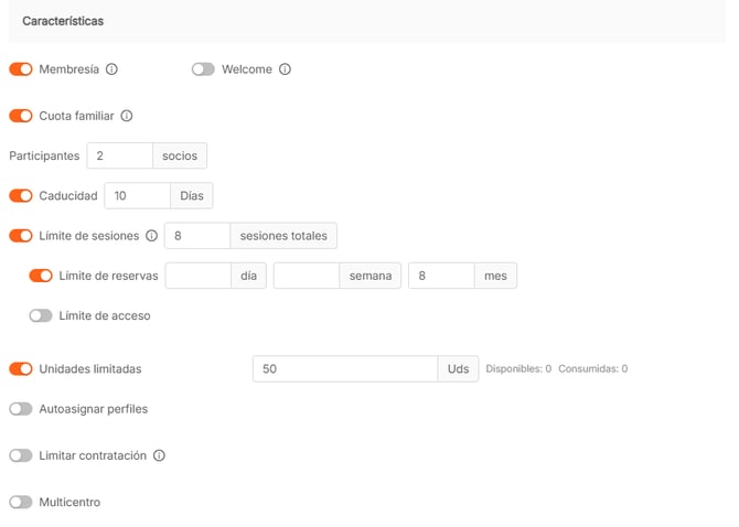 - Características. Mostrará etiquetas con las características configuradas en el producto, como membresía, welcome, prorrateo, familiar y multicentro (sólo aparecerá si el centro pertenece a una cadena).
