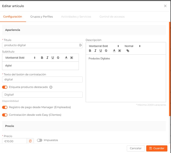 - Contratación desde web Easy (Clientes). Si activas esta opción los clientes podrán adquirir este producto desde la web Easy y app.
