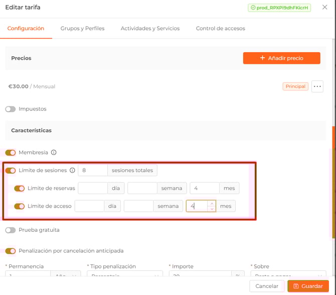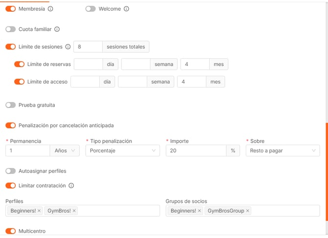 - Penalización por cancelación anticipada. Tendrás que indicar la permanencia mínima del socio (en meses o años) y, en caso de que no se cumpla, que tipo de penalización se le va a aplicar.