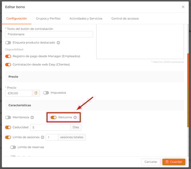 - Welcome. Si activas esta opción, la contratación de esta tarida estará limitada de forma exclusiva a personas que no han adquirido ningún otro producto previamente.
