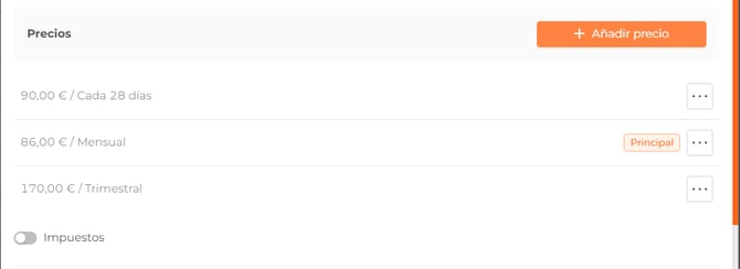 - Pago recurrente. Consiste en un pago periódico y puede ser: mensual, trimestral, semestral, anual o personalizado. Debe indicarse al menos un precio y tendrás que seleccionar cual es el principal.