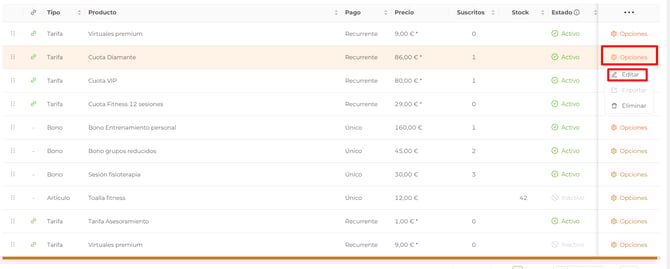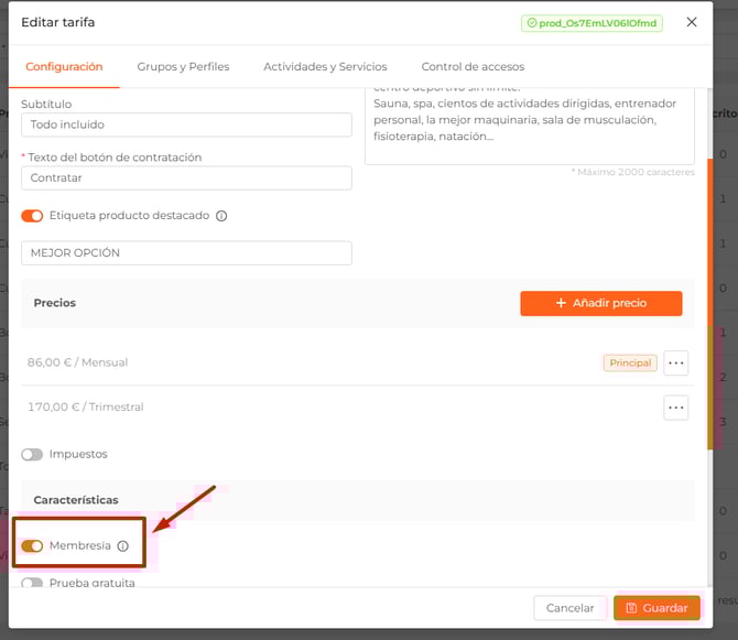 👉Puedes activar un producto para que sea esencial mediante la opción "Membresía" de la edición del producto: