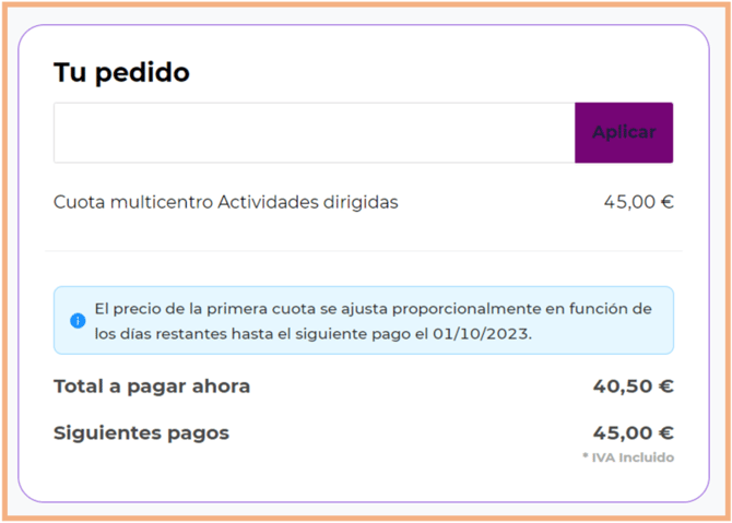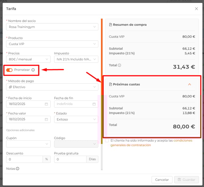 Si el pago prorrateado está activado en la configuración de una tarifa, al registrar un pago (ya sea a través del Manager, la web personalizada Easy o la app móvil), el precio del primer plazo se calculará automáticamente en función de los días que falten para el siguiente pago.