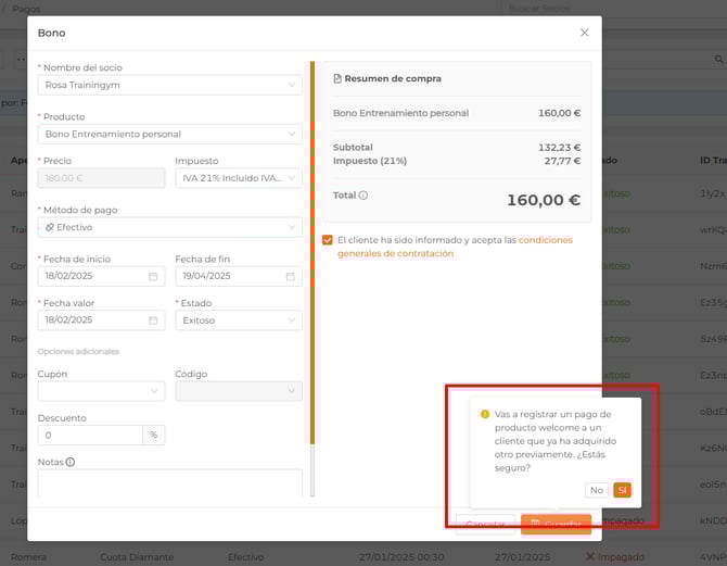 Si intentas registrar el pago de un producto Welcome para un cliente que ya tiene otro producto activo o que ya ha comprado otro producto anteriormente, se mostrará un modal de confirmación con el siguiente mensaje:
