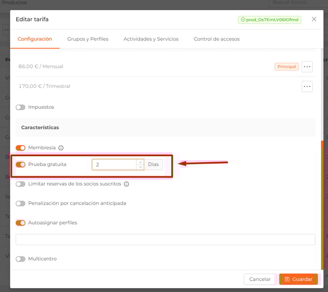 Activa la opción "Prueba gratuita" y establece el número de días que quieres que cuente como prueba.