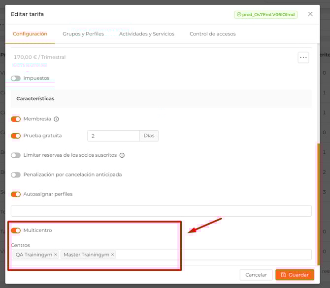 - Multicentro. Si se activa, tus clientes podrán disponer del mismo producto en todos los centros de la cadena, lo que les permitirá reservar actividades en distintos centros.