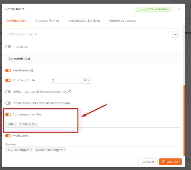 - Autoasignar perfiles: selecciona el perfil o perfiles que quieres que se le asigne a los clientes que contraten esta tarifa.