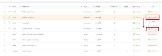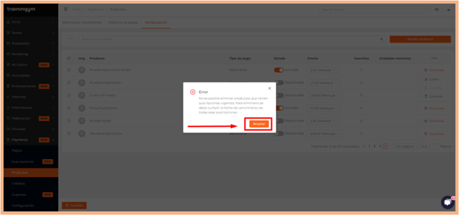 Si hay productos que ya no necesitas, puede eliminarlos desde el menú Payments - Productos - Eliminar, siempre que el producto a eliminar no tenga una suscripción activa.