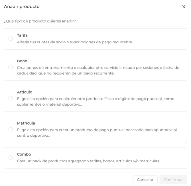 Se abrirá un modal inicial donde seleccionar el tipo de producto que deseas crear: