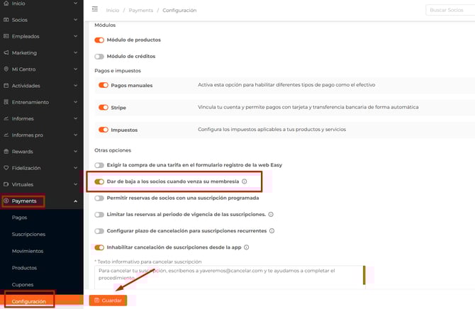 Para que los clientes pasen a baja cuando sus suscripciones acaben, debemos activar la opción "Dar de baja a los socios cuando venza su membresía", que encontrarás en el menú Payments- Configuración - General.