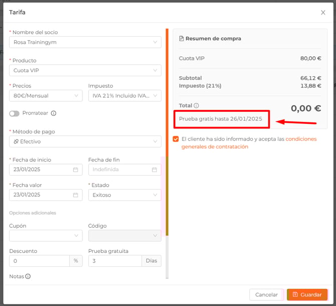 Una vez que hemos introducido todos los datos al registrar un pago y hemos incluido X días de prueba gratuita, al hacer clic en "💾 Guardar" ocurrirá lo siguiente: