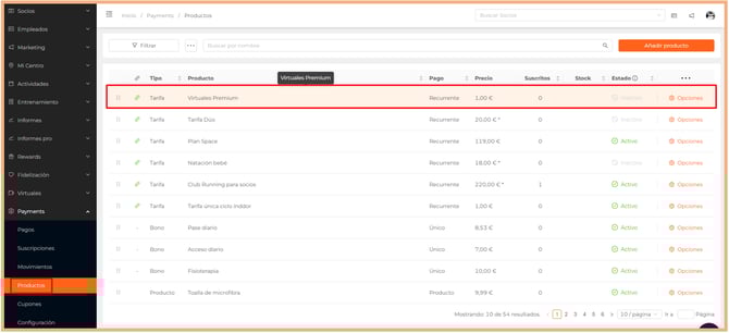 - Desplázate hasta el menú Pagos > Productos.