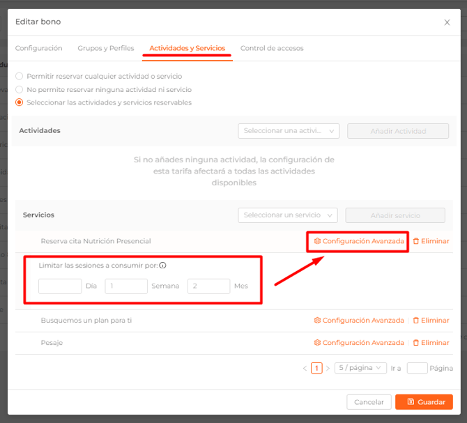 - Límite de reservas: podrás limitar las reservas tanto de actividades como de servicios por día, semana o mes.