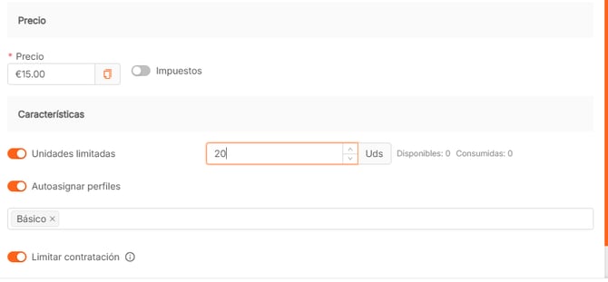 - Autoasignar perfiles: selecciona el perfil o perfiles que quieres que se le asigne a los clientes que contraten este artículo.