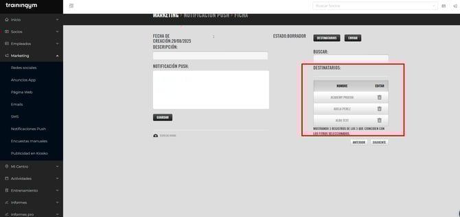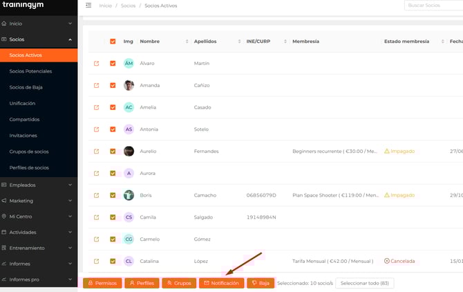 Podemos crear públicos objetivos tanto en campañas de mailing, SMS como notificaciones push. Para poder crear público objetivo dirígete al listado de socios al que quieres enviar las notificaciones.