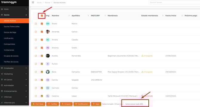 - Una vez aplicado el filtro, selecciona los socios resultantes. Puedes hacerlo seleccionando socio por socio o clicar en el cuadro de la fila superior y marcará automáticamente todos los socios de esa página. Si quieres marcar todos los resultantes del filtro, puedes clicar sobre Seleccionar todo.