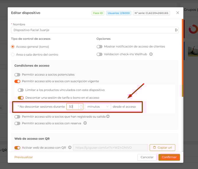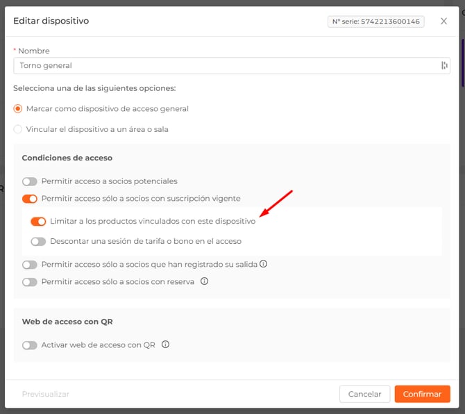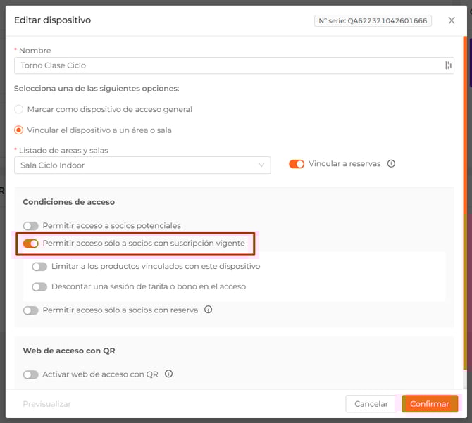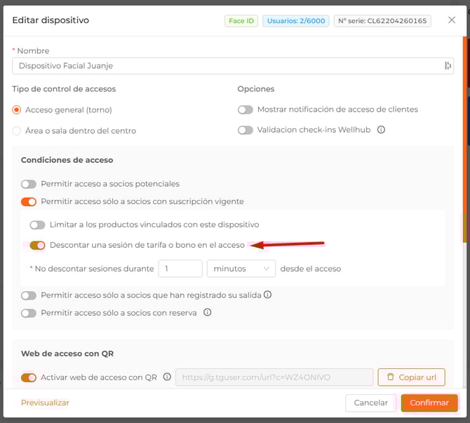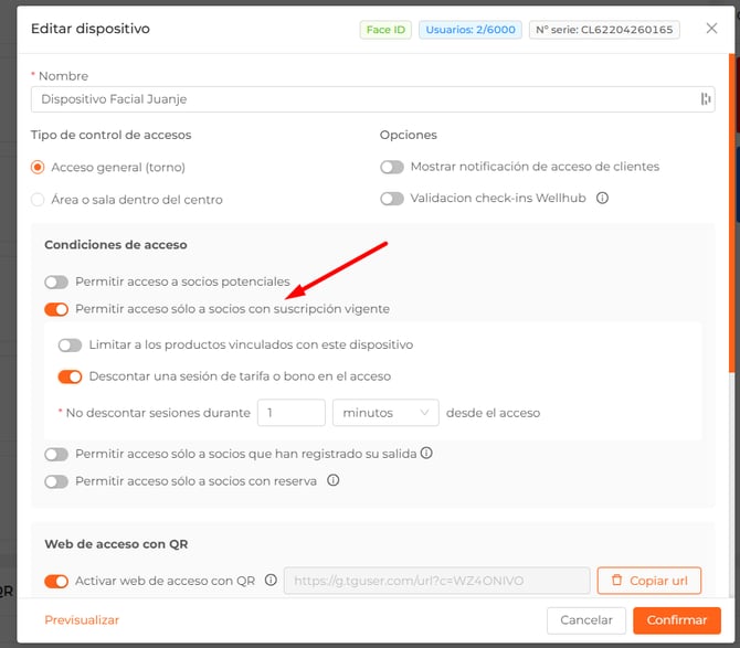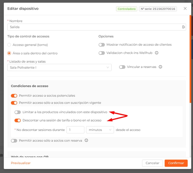 Para que se puedan descontar sesiones por acceso, el dispositivo deberá tener el check "Permitir acceso solo a socios con suscripción vigente" activo.