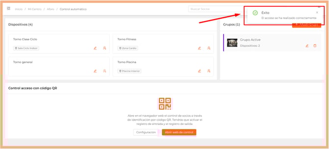 Si el socio intenta acceder al centro o a una sala y no cumple con las condiciones establecidas en el dispositivo, su acceso será denegado. Además, recibirá una notificación push que le informará del motivo por el cual no puede acceder.
