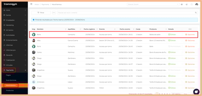 Al igual que cuando los clientes reservan una actividad de pago, podemos consultar los movimientos desde