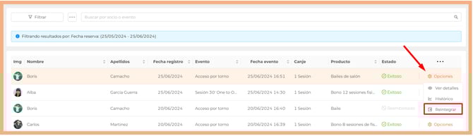 - Completa el motivo del reintegro si lo deseas y pulsa "Reintegrar" para que se produzca el reembolso de la sesión.