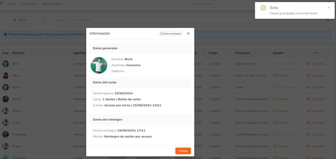 - Se mostrará un mensaje de éxito y podremos consultar los detalles del movimiento reembolsado si pulsamos sobre él.