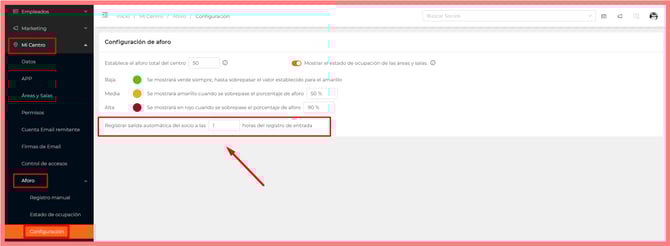 - Para evitar la baja de un socio si se tiene el permiso "Dar de baja a los socios cuando venza su membresía", la validación de la sesión por acceso dependerá del delay de salida automática configurado en Mi Centro > Aforo > Configuración.