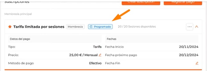 Los productos (tarifas y/o bonos) en estado "Programado" no se tendrán en cuenta a la hora de descontar una sesión al cliente.