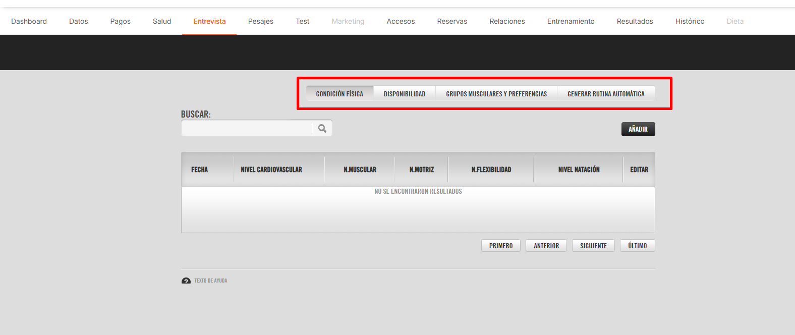 Dentro de la pestaña ENTREVISTA encontraremos 4 opciones: CONDICIÓN FÍSICA, DISPONIBILIDAD, GRUPOS MUSCULARES Y PREFERENCIAS, Y GENERAR RUTINA AUTOMÁTICA.