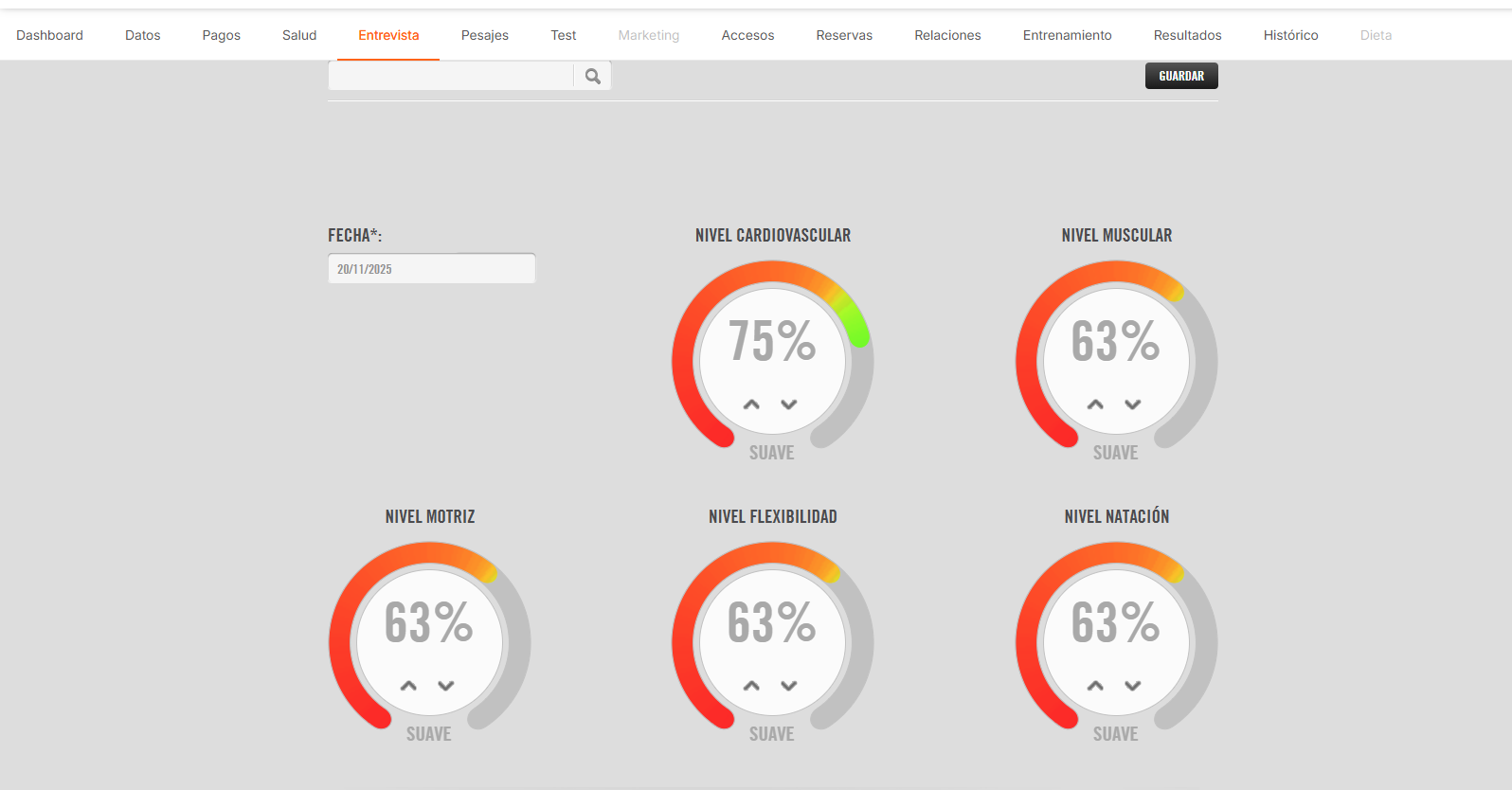 En esta primera pantalla marcaremos el nivel de condición física de base con el que parte el sujeto. Al clicar en AÑADIR se desplegarán unas aparecerán unos "contadores" o "ruedas de color" en los que podemos registrar los Niveles Cardiovascular, Muscular, Motriz, Flexibilidad y de Natación. Clicando sobre ellos podemos especificar el nivel que posee nuestro socio en términos porcentuales.