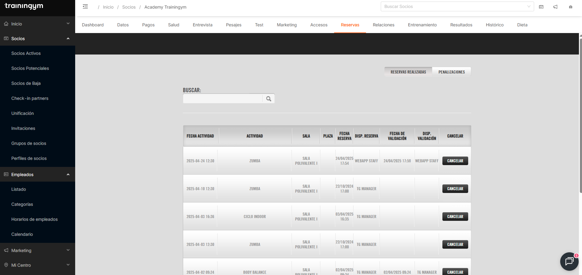 Desde este apartado es posible consultar todas las reservas realizadas en actividades, comprobar si han sido validadas, identificar desde qué dispositivo se han gestionado y revisar si el socio está penalizado actualmente o lo ha estado en el pasado.