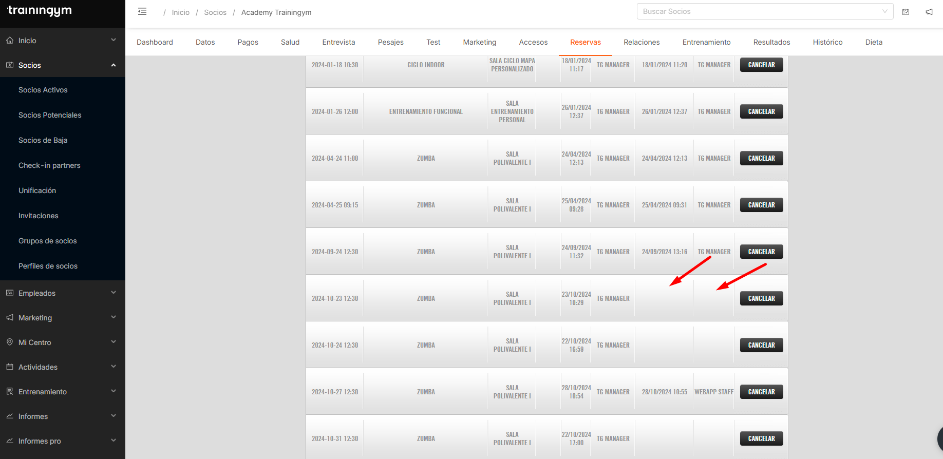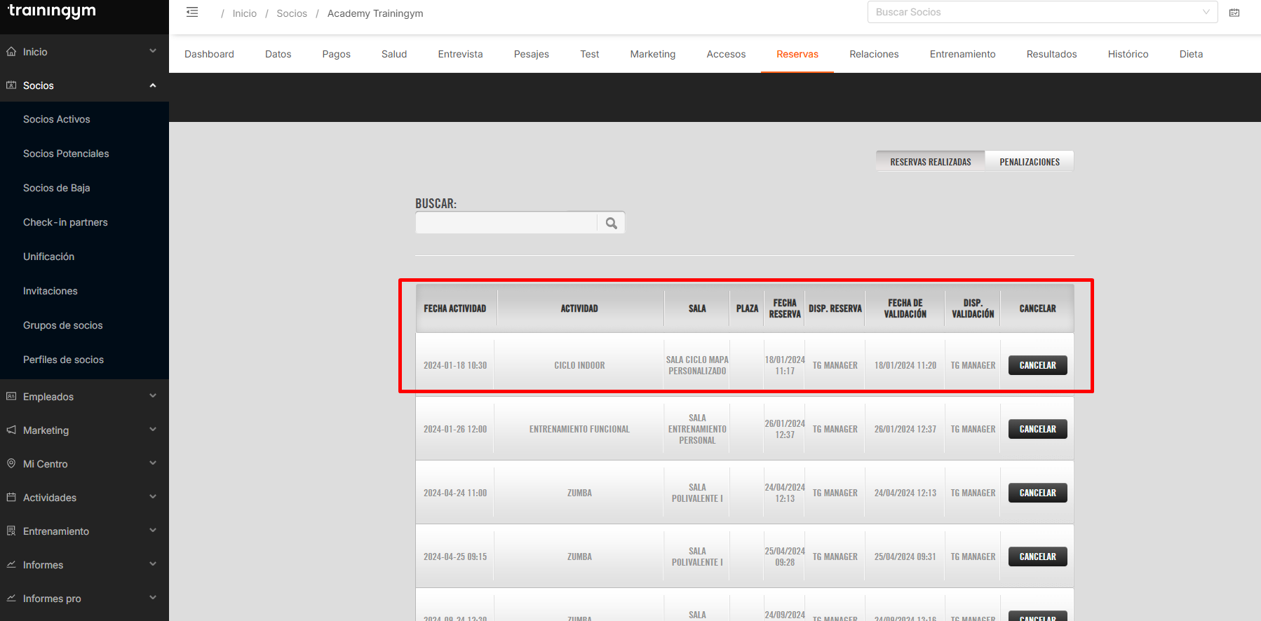 Dentro de la ficha del socio en Trainingym Manager, la pestaña Reservas es una herramienta clave para conocer el historial de participación del cliente en las actividades del centro.
