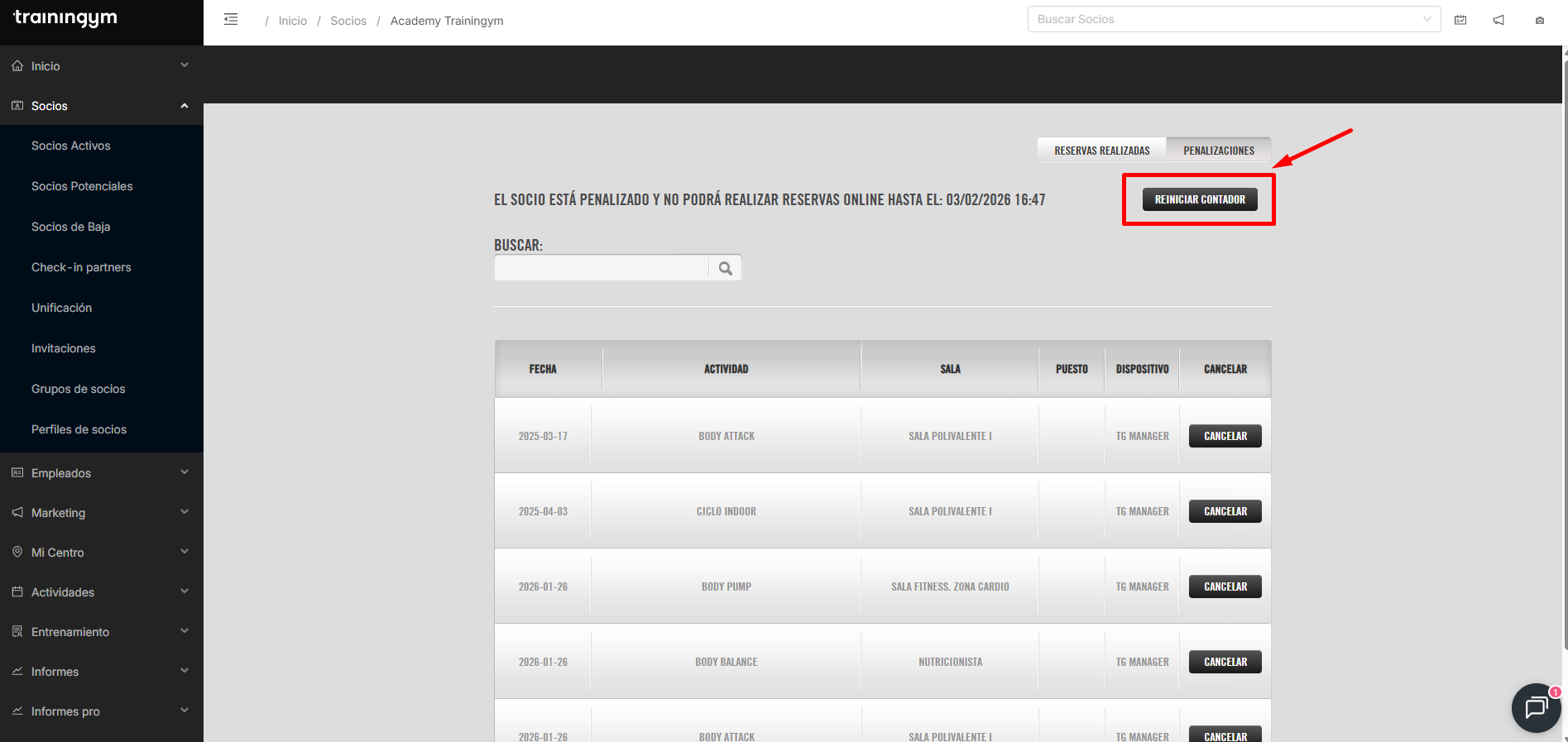 Para ello, clica en Reiniciar Contador y la penalización del socio desaparecerá. Esta acción permite restaurar el acceso del socio a las reservas de actividades.