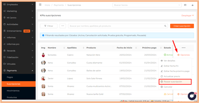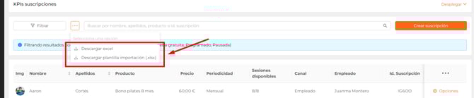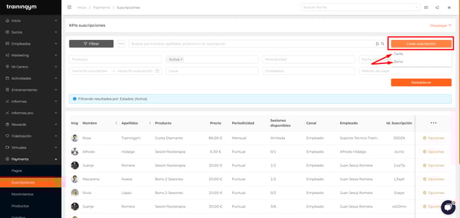 En este listado sólo encontrarás las suscripciones de clientes a tarifas y bonos. No se mostrarán las compras de paquetes de créditos, que podrás consultar en el menú "Créditos" si tu centro tiene activado este módulo, ni tampoco los artículos, matrículas ni pagos personalizados, que podrás consultar desde el listado de Pagos.