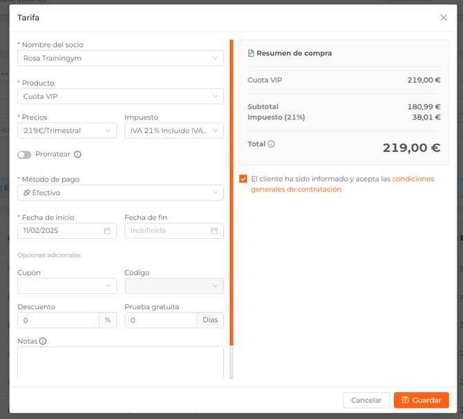 ℹ️ Si deseas cancelar una suscripción que tiene penalización y quieres que no se cobre esa penalización al socio, antes de cancelar debes: